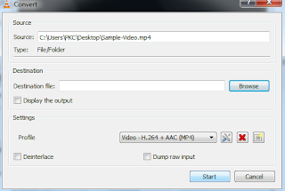 In the next VLC Media Player windows you have to give five destination path, and select the format that you want to convert [Using VLC you can convert it into other 13 video and audio formats new VLC Media Player]. And Click on Start button.